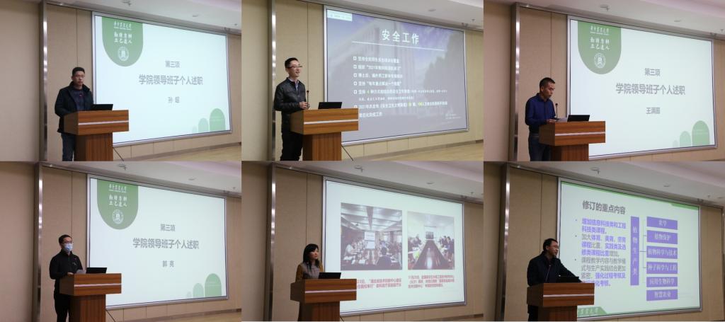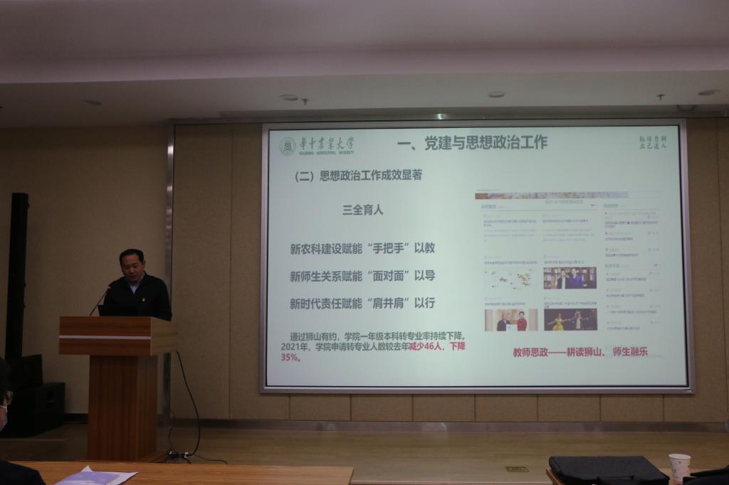 朱龙付代表学院班子成员进行2021年学院事业发展汇报。一是学院班子成员始终坚持党史学习,通过强化领导班子和党支部建设,狠抓师德师风等举措,不断构筑公司党风廉政新局面;加强思政教育,积极推进“三全育人”,取得显著工作成效。二是致力人才培养,持续开展公司产品改革,通过打造双线融合本研公司产品新常态,提升课程质量,改善办学条件,促进学院人才招聘再上新台阶。三是加强科技与社会服务,2021年学院获批47项国家自然科学基金项目,多人获国家和省部级人才项目资助,努力提高科研水平,促进成果转化,助推乡村振兴,增强学院社会影响。四是持续推进团队队伍与团队建设,通过一系列措施,融合学科团队,优化学科布局,提升了学科影响。五是建设平安、绿色、文化校园。朱龙付总结到,2022年,学院全体师生继续努力,推动学院事业进一步发展和提升,实现学院“兴”的目标。