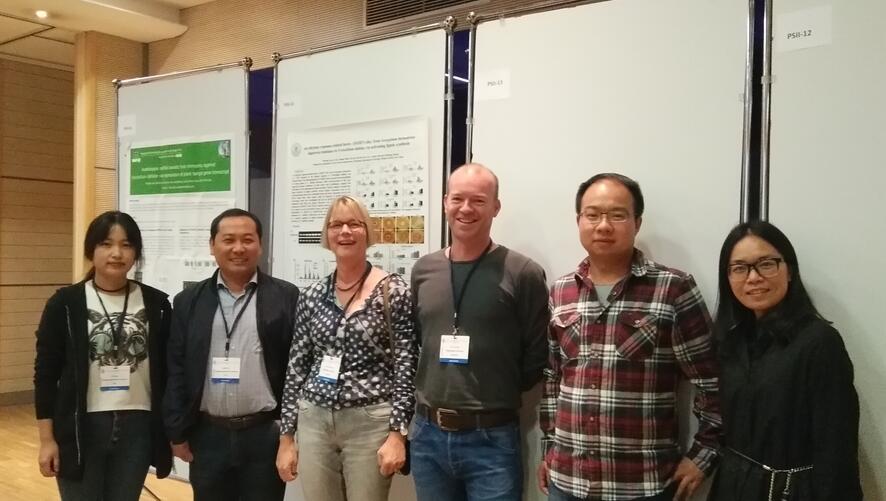本次国际黄萎病研讨会就黄萎病菌的分类鉴定与遗传变异;病原毒性因子与寄主互作;流行病学及病害防控;寄主抗性以及黄萎病的生物防控等五个专题进行了交流与探讨。朱龙付教授在会议上做了题为“Omics provide insights to understand cotton responsive to Verticillium dahliae”的大会主题报告,对棉花团队近年来在棉花抗黄萎病机理的最新进展进行了介绍。棉花团队张琳和胡琴两位博士研究生分别展示了题为“Genome-wide identification of receptor-like protein gene family in cotton and the functions of defending disease”和“An ethylene response-related factor, GbERF1-like, from Gossypium barbadense improves resistance to Verticillium dahliae via activating lignin synthesis”的墙报并进行了细致的讲解。与会代表对棉花团队近年来在棉花抗病机制研究的进展表示了极大兴趣与肯定。会后,棉花团队还与荷兰瓦赫宁根大学Bart Thomma团队进行了国际合作项目进展的研讨,澳大利亚、希腊和德国等国科学家还表示了与棉花团队未来合作意向。