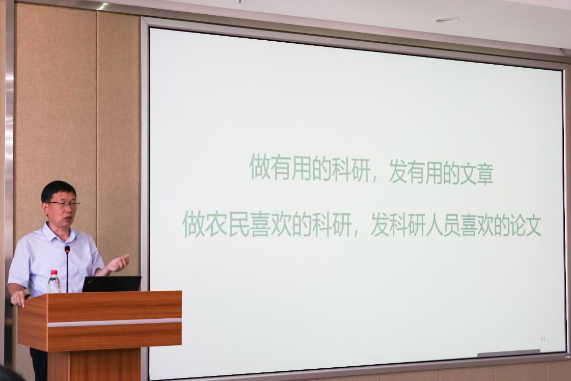 活动在彭少兵教授的专题报告中拉开帷幕。他以自己三十年来的科研历程为主线,在介绍自己科研内容的同时,也向在座的各位教师提出了自己对科研的见解与建议。他鼓励大家结合实际生产,关注前沿发展趋势,积极思考,科学创新。“做有用的科研,发有用的文章;做农民喜欢的科研,发科研人员喜欢的文章。”彭少兵老师总结道。
