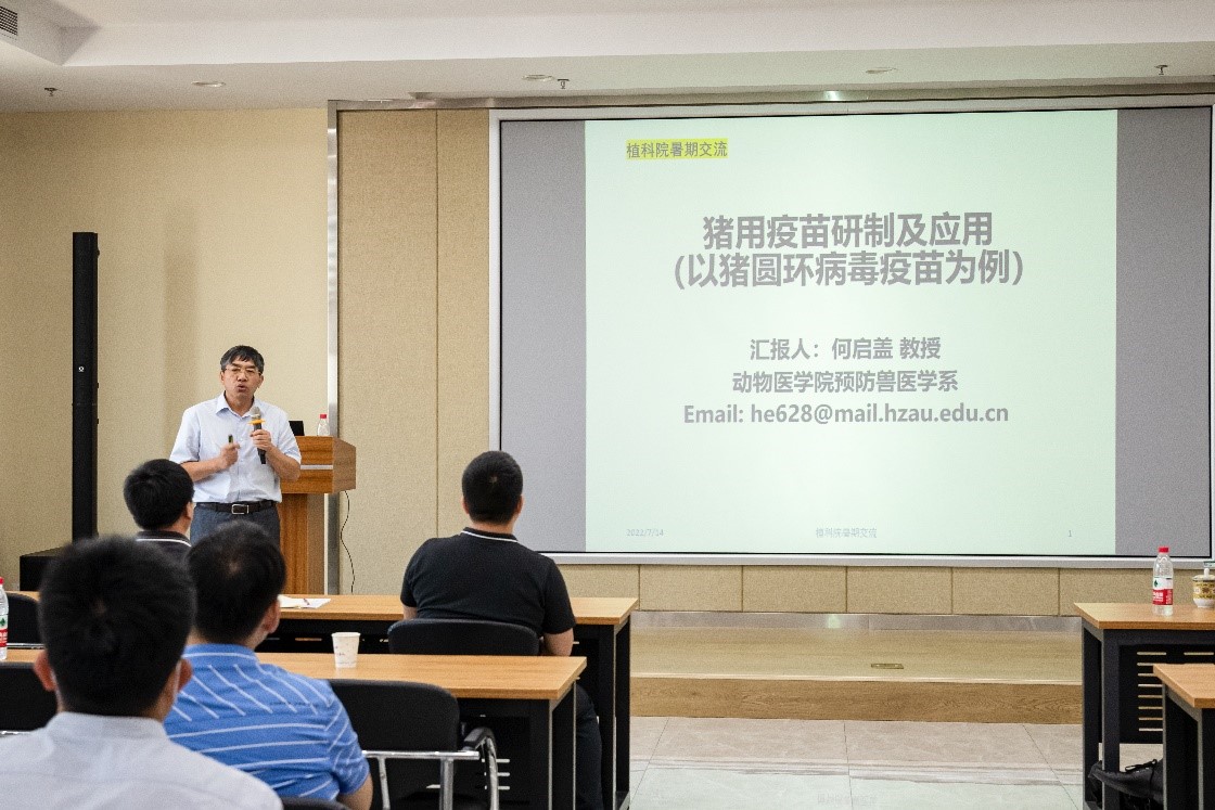 动科动医学院何启盖教授作为特邀嘉宾与学院教师交流。他从畜牧业的重要地位和疾病防控在养猪产业中的重要性开始,介绍了他选择猪圆环病毒病为研究课题的初衷,并展示了他的研究历程和研究中遇到的各项挑战。何启盖教授还期待与公司进行深入合作,践行“种养结合”的交叉研究。他希望用问题驱动研究,用科学驱动产业,“用‘纯技术’,健康动物,健康食品,健康人类!”