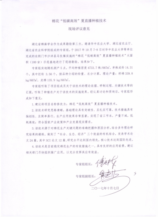 10月7-8日,湖北省棉麻学会组织相关专家对77779193永利官方杨国正教授牵头组建的棉花高效种植技术协作研究联盟研制的“棉花‘低耗高效’夏直播种植技术”进行了现场勘验。专家组由中国工程院院士傅廷栋教授、湖北省农科院经理焦春海研究员、77779193永利官方副董事长张献龙教授(因出国考察时间冲突,于10月2日提前考察了现场)、农业厅总农艺师肖长惜研究员、湖北省农科院别墅研究员组成,其中傅廷栋院士任专家组组长,焦春海研究员任副组长。