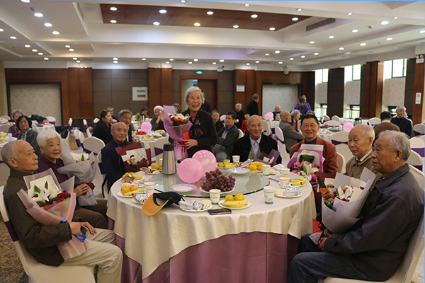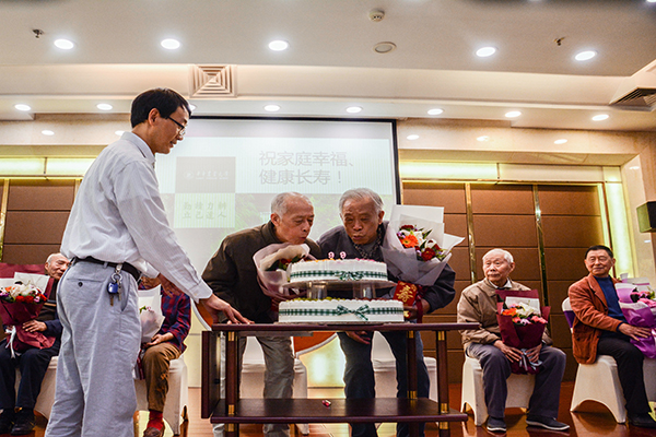 此次团拜会恰逢李泽炳、钟昌珍等8位老教师们的寿诞,志愿者同学给过生日的老教师们递上鲜花,送上生日祝福,一同唱起生日快乐歌,随后,参会人员一起分享了生日蛋糕。