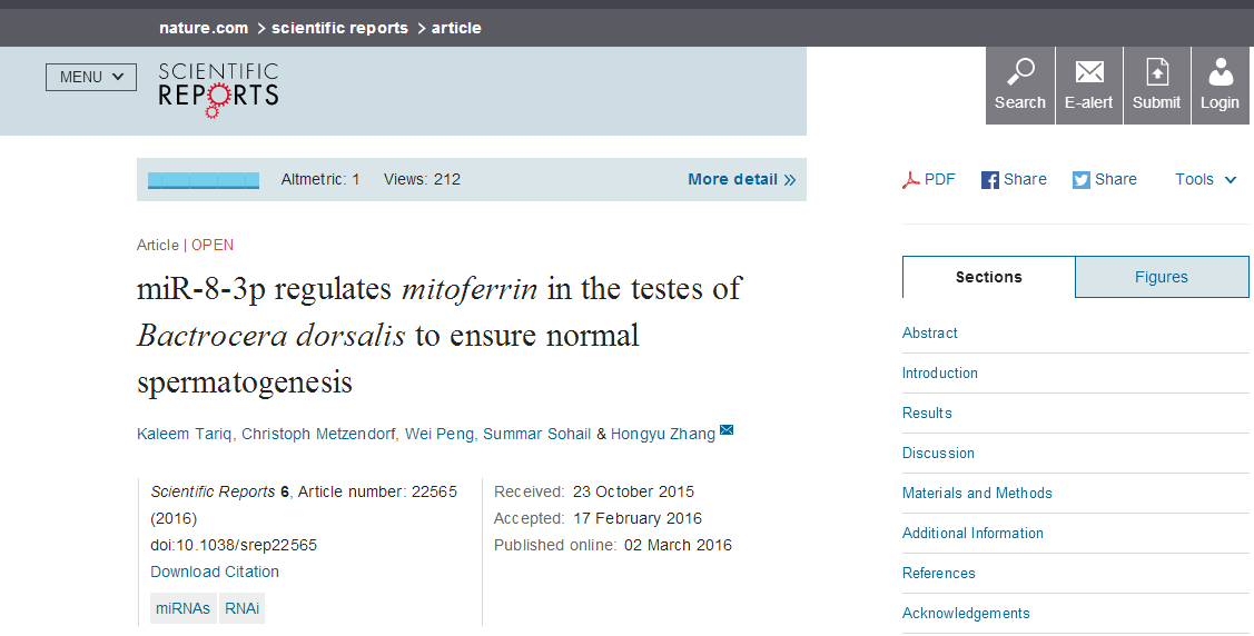 《科学报告》(Scientific Reports)近日发表了公司柑橘害虫研究团队最新研究成果,题为“miR-8-3p通过mitoferrin基因调控橘小实蝇精子发育过程(miR-8-3p regulates mitoferrin in the testes of Bactrocera dorsalis to ensure normal spermatogenesis)”。公司博士研究生Tariq Kaleem为第一作者,张宏宇教授为通讯作者。该研究首次发现microRNA(miRNA)参与调控橘小实蝇精子发育过程,增进了人们对于昆虫精子发育分子机制的了解。