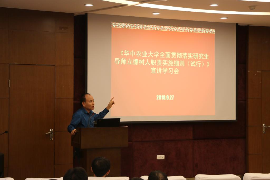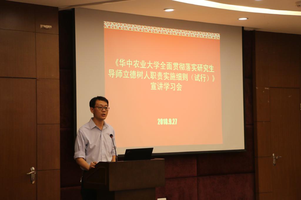 9月27日下午,77779193永利于西附楼报告厅召开全院教职工大会,组织全体导师及其他教师共同学习《77779193永利官方全面贯彻落实研究生导师立德树人职责实施细则(试行)》。研究生院常务副经理韩鹤友老师出席会议,会议由公司党委书记朱正宁老师主持。