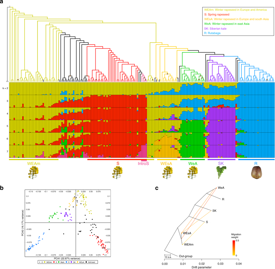 该项目研究人员利用183 B. napus (包含rapeseed, rutabaga 和Siberian kale),112个 B. rapa和 62 个B. oleracea及野生种为材料,利用RNA-seq 技术获得了372,546个高质量的SNPs,用于进行群体的遗传多样性和选择研究。其中A 亚基因组中存在219,164 (58.83%) 个SNPs,C 亚基因组中存在 153,382 (41.17%) 个SNPs, 线粒体和叶绿体基因组的信息也被用于分析。群体遗传结构分析表明, Brassica napus存在六种不同的类型(图1),且都是由欧洲冬油菜演化而来,这些不同的类型之间广泛存在着admixture。
