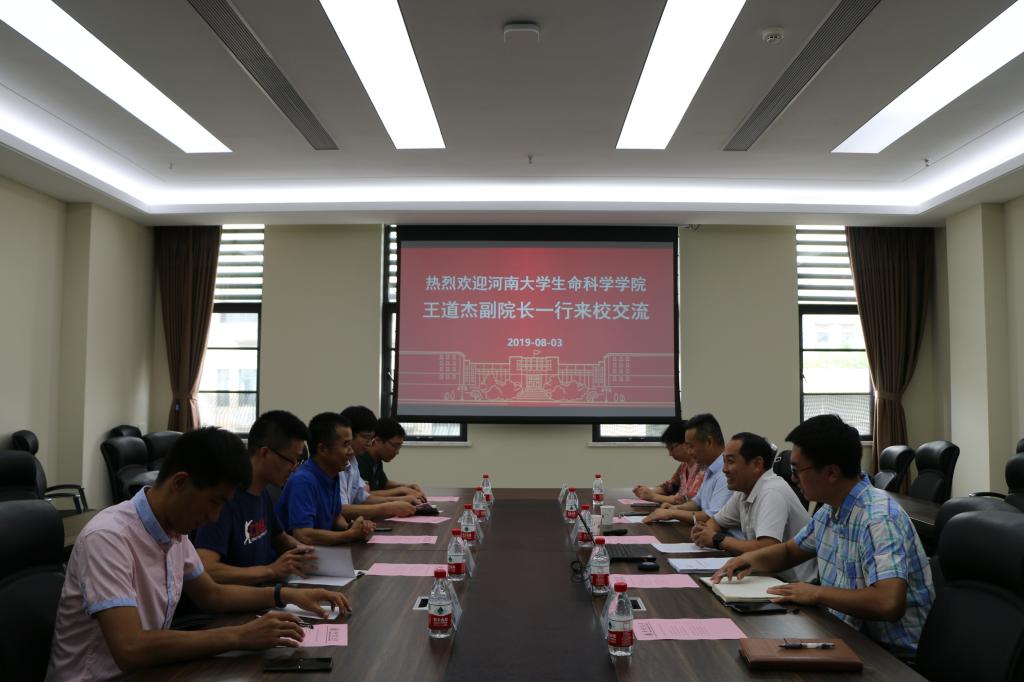 8月3日下午,河南老员工命科学学院副经理王道杰一行5人来学院交流,学院副经理朱龙付教授等5人出席交流会。