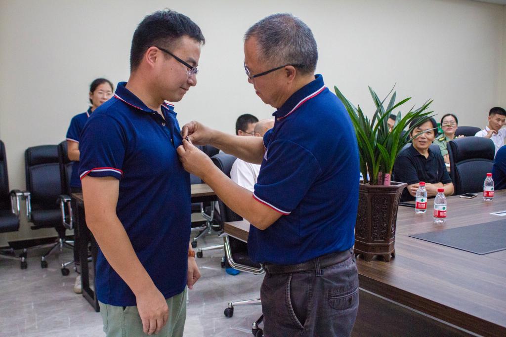 会议伊始,周雄为2018-2019年入职的教师颁发聘书,老教师为新教师佩戴校徽,新教师向老教师赠送兰花。