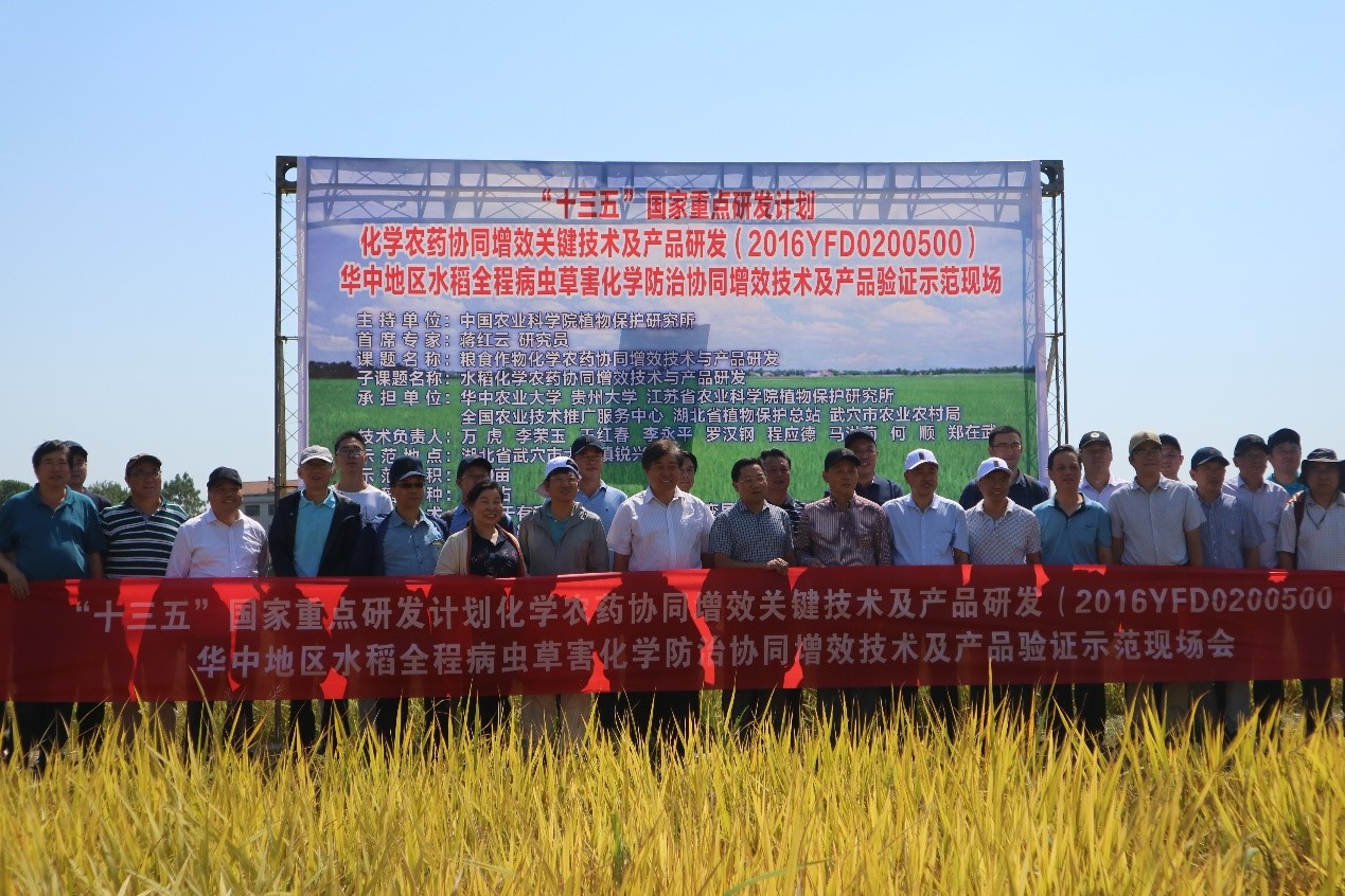 2019年9月22日,由77779193永利承办的国家重点研发计划项目“化学农药协同增效关键技术及产品研发”子课题“华中地区水稻全程病虫草害化学防治协同增效技术及产品” 验证示范现场会在湖北省武穴市召开。公司党委常委、组织部统战部部长李向东、农业微生物学国家重点实验室主任姜道宏教授、科学技术发展研究院重大项目管理处处长杨毅、农业农村部种植司农药管理处黄辉调研员、全国农业技术推广服务中心王凤乐首席专家、农业农村部农药鉴定所张宏军处长、湖北省农业农村厅党组成员肖长惜总农艺师、湖北省植物保护总站站长郭子平、中国农业科学院植物保护研究所副所长郑永权研究员、武穴市市长陈风、项目首席蒋红云研究员以及湖北省农业科学院、武穴市农业农村局等单位领导、武穴市各乡镇农技中心技术人员、当地种植大户、农民和项目相关参加单位骨干人员等100余人应邀参加本次会议。