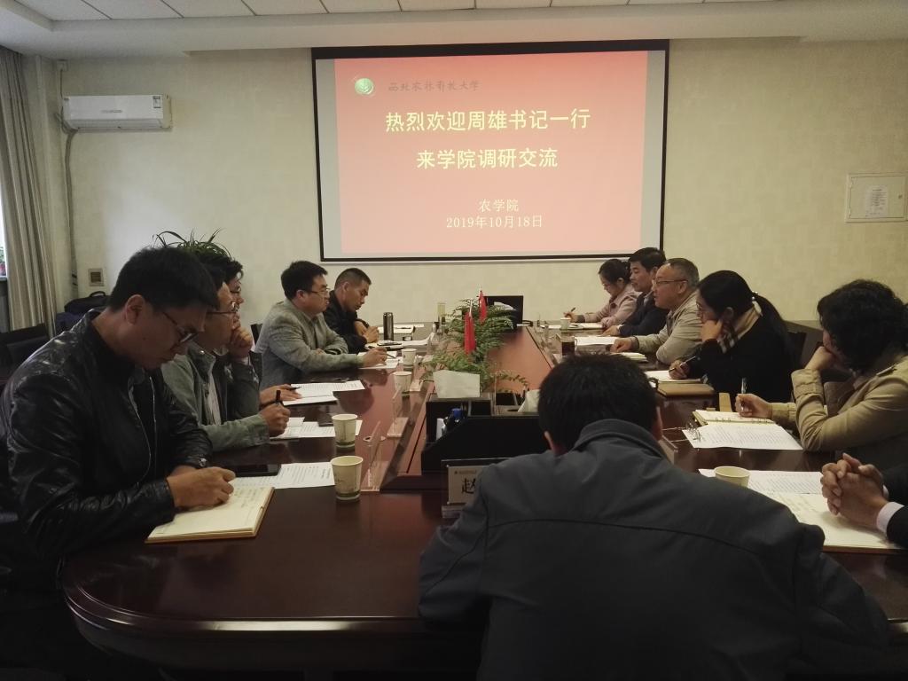 在农学院,公司党委书记张海成、副书记吴清华、副经理胡宝仓、副经理韩娟等热情接待了周雄一行。张海成介绍了学院发展历史沿革,并从“一会”“一表”“一网”“一助手”四个方面谈了学院在党建工作上的举措和想法。韩娟介绍了学院在吸引推免生、培养优质生源、导师招生指标分配等工作上的做法。双方就“一会”“一表”“一网”“一助手”和导师招生指标分配等内容进行了交流。