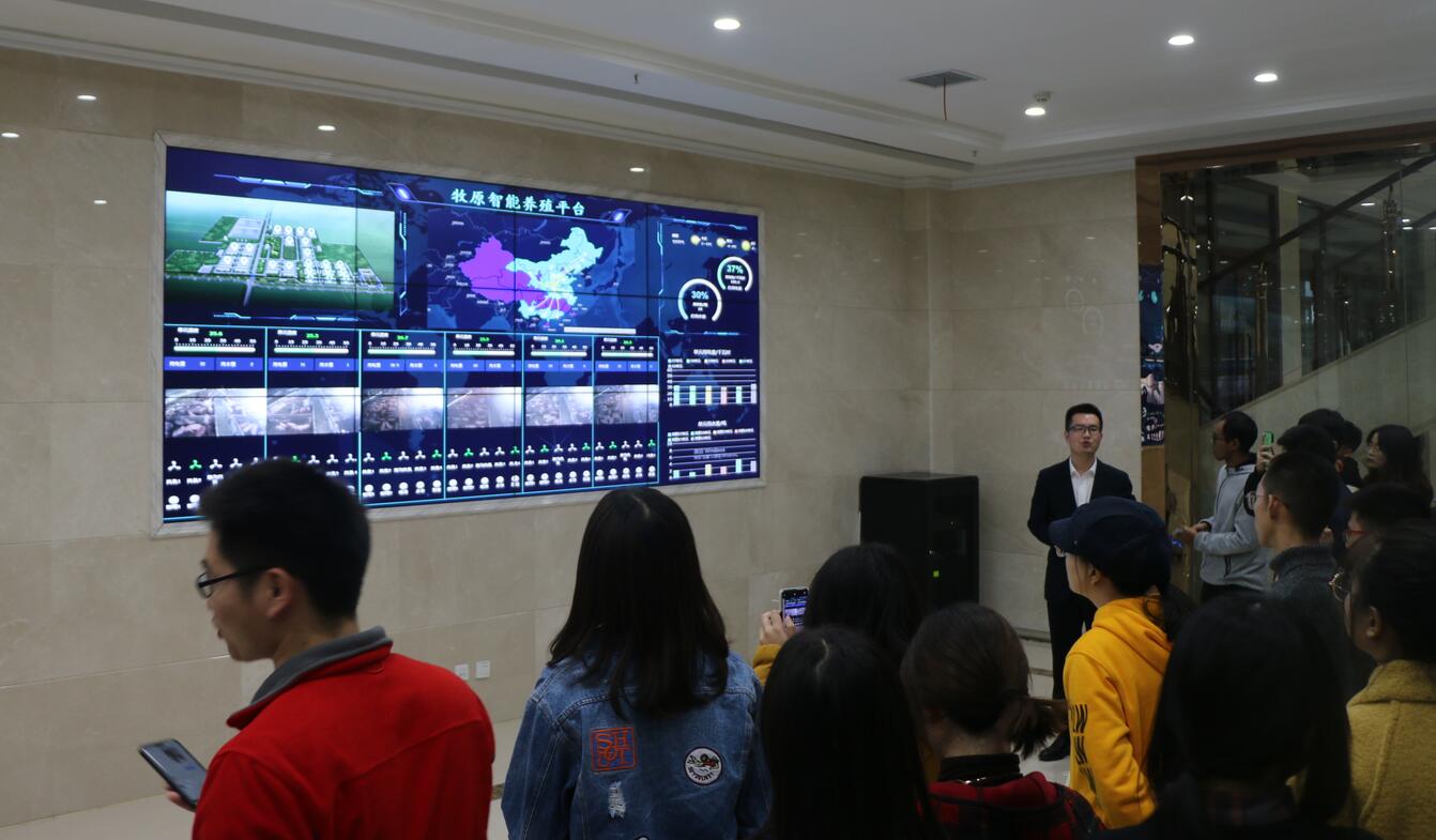 在牧原集团总部,工作人员向同学们简单介绍了牧园集团部门构架和企业文化。在书籍区的智能化养殖模型前,同学们直观得看到智慧型猪舍的结构和运转模式。养殖平台可以实时监测猪舍内部情况,随时调节猪舍环境,确保生猪在适宜环境条件下生长。饲养员进行智能化养殖,利用机器人实现饲料投喂等,减少人与猪的接触,对猪群健康管理水平意义重大。在销售部的全国生猪价格实时监控屏幕前,工作人员向同学们演示了牧原集团的生猪生产销售数量以及交易金额,每日的生猪流向地区及区域价格地图。