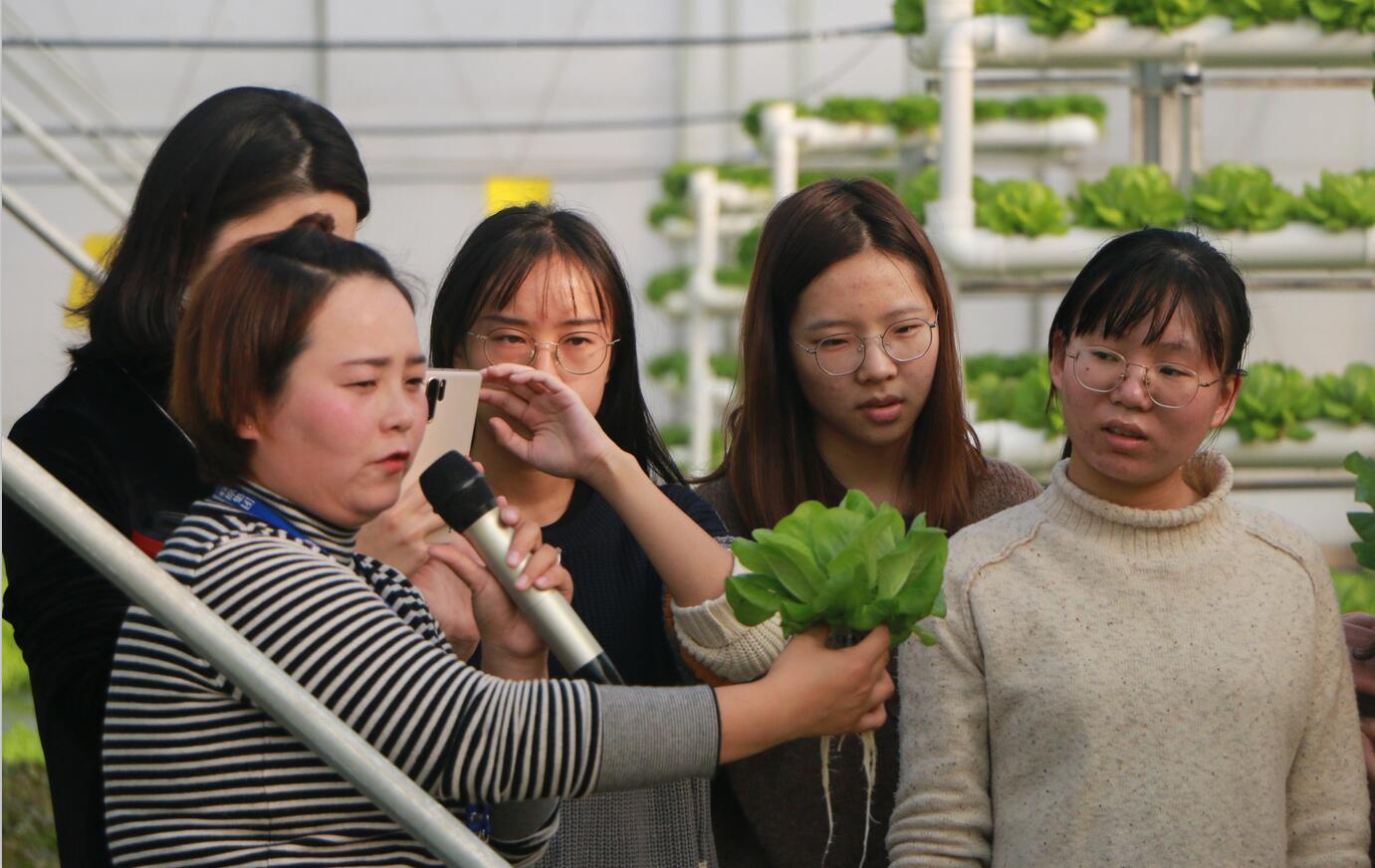 在生菜无土栽培基地,园内的生菜均卡植在专用的泡沫板上,漂浮在营养液池中生长。现场的工作人员随机拿起一块泡沫板,向同学们展示了生菜的根部生长情况。此外,工作人员还详细介绍了营养液池的循环系统和鱼菜共生系统,先进的技术使同学们大开眼界。