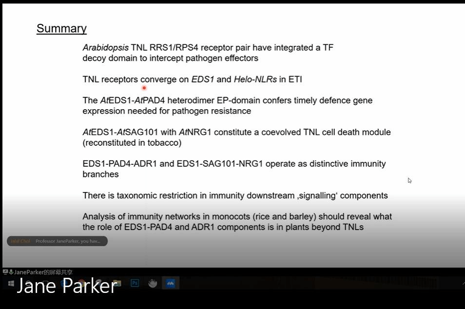 Jane E. Parker教授报告中阐述NLP免疫信号传递相关研究工作。植物通过细胞内NLP免疫受体识别活体营养性型病原物并感知其对寄主细胞的干扰、进而将病原效应子识别信号传递至下游寄主防御和细胞死亡相关途径;鉴定了抵抗病原物独特的NLR诱导的防御途径,以及这些途径在植物细胞和组织中操控免疫的机制。进一步研究表明,某些NLR下游信号或抗性执行模块在植物不同种间协同进化。这些发现进一步加深了对植物功能性先天免疫途径的认知,以及将潜在有用抗性调控机制应用在农作物(如单子叶作物水稻)免疫机制的研究上提供了重要的信息。