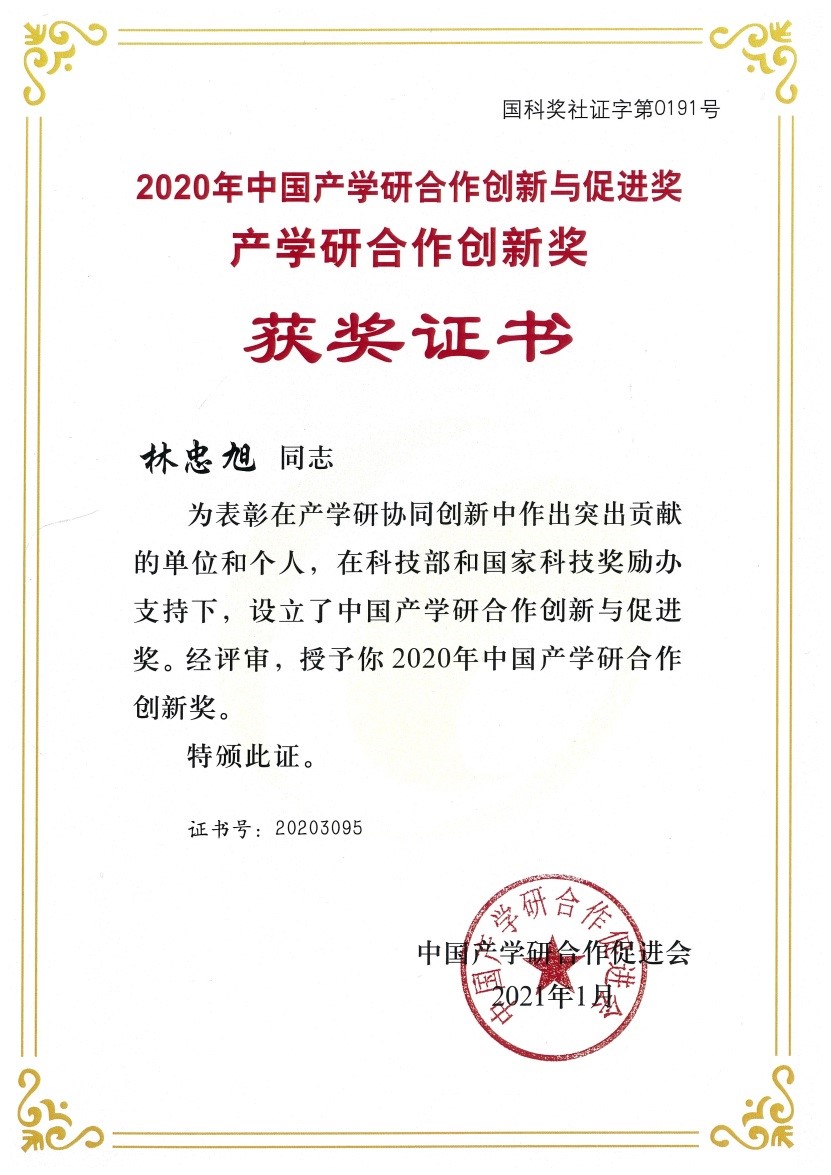 近日,中国产学研合作促进会公布了“2020年中国产学研合作创新与促进奖”评选结果,公司林忠旭教授荣获“2020年中国产学研合作创新奖”个人奖。